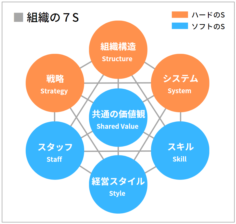 この7Sが作られた当時、組織変革にはハード面の3つS(戦略、組織構造、システム)の見直しが 重要だと思われていました。しかし、この見直しだけを行っても成果を出す組織には生まれ変わらないということが調査研究の中で明らかになったのです。実際に、成果を出す組織になるためには、ソフト面の4つS(共通の価値観、スタッフ、経営スタイル、スキル)が、変化して初めて組織は変わります。ちなみに、(1)~(3)の戦略、組織構造、システムが「ハードの3S」(4)~(7)の共通の価値観、スタッフ、経営スタイル、スキルが「ソフトの4S」と呼ばれています。