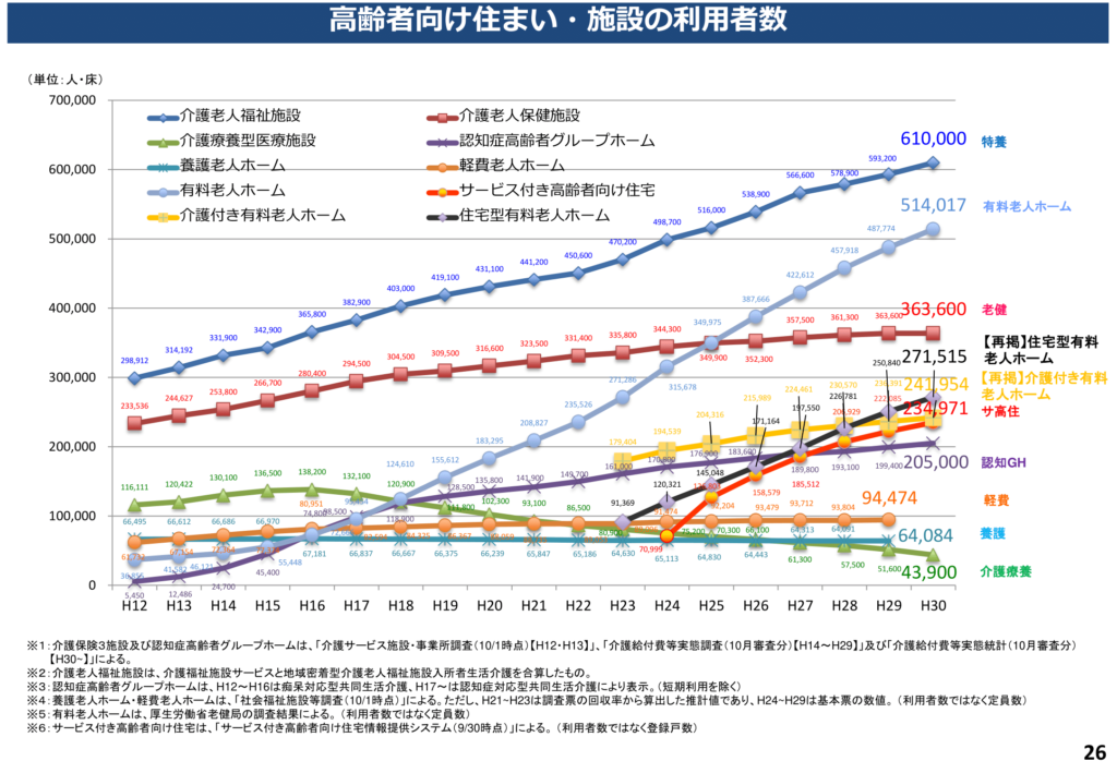 出典:国土交通省 – 第3回サービス付き高齢者向け住宅に関する懇談会資料 2020/01/29資料2また、行政の政策から見ても参入の余地はあります。国は、社会的入院から施設での介護へ、そして在宅での介護(医療)と医療・介護の場を移すことで、国で負担する額を減らそうと動いています。この動きからも、医療・介護を受けやすい住宅の提供を行うことは今後のニーズに合っていると言えます。ただし、ただ高齢者向けの住宅を建てれば成功するという訳ではありません。