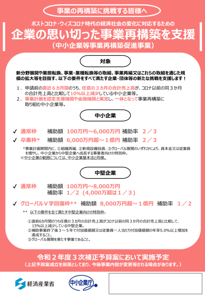 - そのため、思い切った事業再構築を行う中小企業を支援する