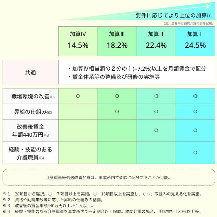 令和6年度の介護報酬改定では、処遇改善に係る加算は「介護職員等処遇改善加算」へ一本化され、新しい介護職員等処遇改善加算はⅠ~Ⅳの4段階となっています。