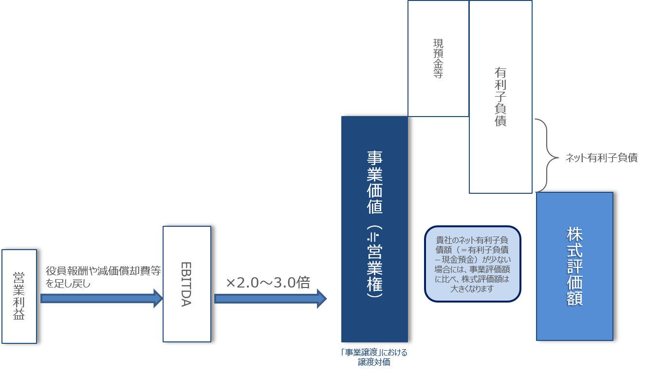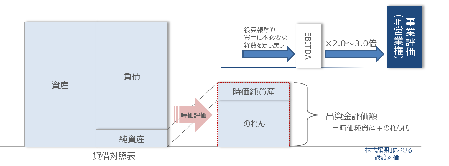 「時価純資産」 と 「のれん代(営業権)」 の総和により算定する方式です。