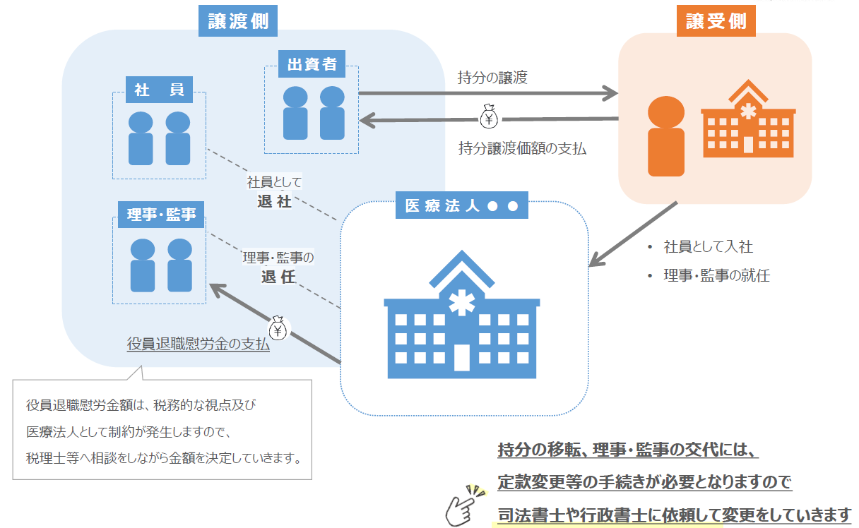 出資持分の有無にかかわらず医療法人の法人譲渡の場合は必要な手続きとなります。 社員及び理事の交代にて、実質的に経営権の譲渡を行います。