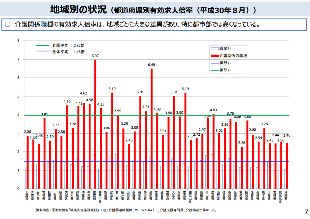 また、地方よりも都市部での人材不足が深刻な問題となっており、東京都の介護関係職種の有効求人倍率は6.97倍、次いで愛知県が6.49倍という数値です。地方は高齢化率のピークアウトを迎えつつありますが、都市部では今後も更なる高齢化が進むと予想されるため、人材不足の問題は今後も続いていくことでしょう。