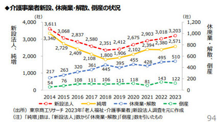 しかし、実際には高齢化や人手不足を理由とした倒産が増加する一方で、大規模化や協働化の推進とは裏腹に、新設の法人が増加しており、結果として介護事業者の総数は増加しています。