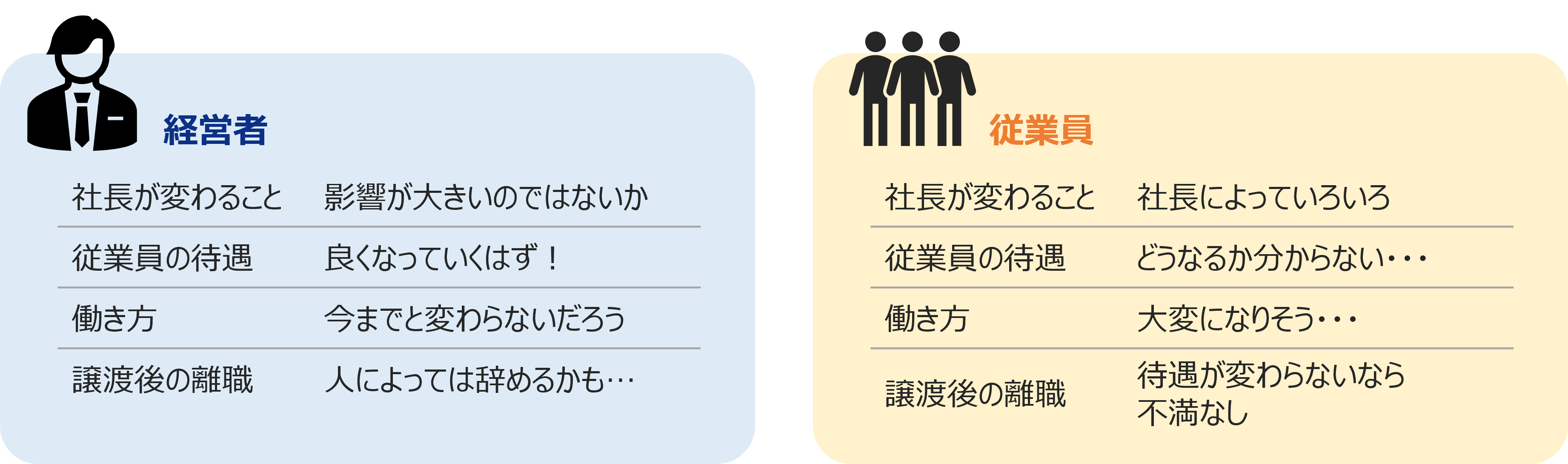 待遇面については、早期に説明を行わないと、憶測が飛び交って従業員の不安が募る傾向があります。多くの場合、事業承継後に仕事が増えるのではないかというイメージが先行しがちです。実際に仕事が増えるケースもあるため、一概には言えないですが、スタッフへの細かな説明が必要です。また、社長が従業員の2人分以上働いているケースが多いため、譲渡後に従業員に負担が広がらないように注意する必要もあります。
