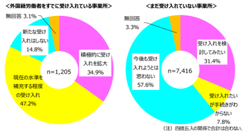 介護大手企業では、日本の介護業界で働くことを希望する海外の人財については、技能実習生としてだけでなく、留学生として新卒採用において受け入れる仕組みを確立したとの発表もされていますが、介護事業所における外国人介護人材の今後の受け入れ方針は、受け入れ経験の有無によって、意識・関心が大幅に異なります。