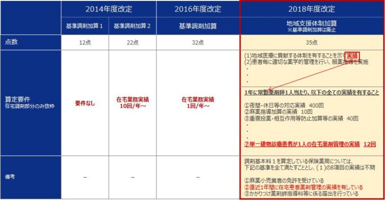 加えて、16年度まで施行された基準調剤加算、18年度に新設された地域支援体制加算の在宅部分の要件でも徐々にハードルが見直されています。