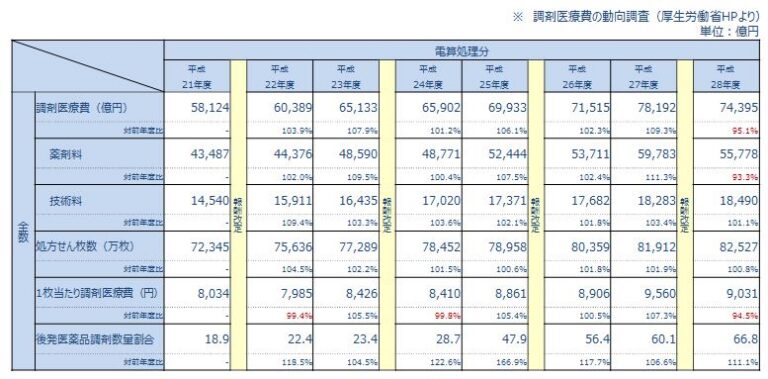 しかし、内訳をみると後発医薬品使用割合の増加とともに薬剤料が減少(もちろん薬価の引き下げも影響)し、技術料は影響なし(もしくは微増)と見ることもできます。