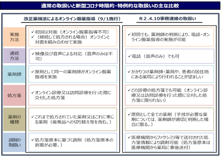 いずれもオンライン服薬指導を許可するものですが、実施の要件や対象患者が異なるため、それぞれのルールを理解しておく必要があります。