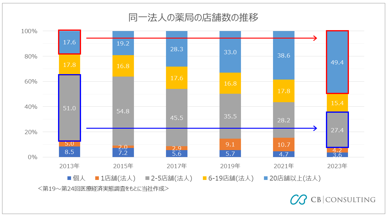 20店舗以上の薬局を運営する法人(グラフ赤枠)は、2023年までの10年で31.8%も店舗数シェアを伸ばしています。一方で、2~5店舗の法人(グラフ青枠)は、この10年で23.6%と大幅にシェアを落としています。例えば、2~5店舗の法人の経営が20店舗以上の法人に丸ごとM&Aで移譲されたり、2~5店舗の法人が一部切り離しを行っていたりする結果です。つまり、医薬分業の進展や薬局経営の高度化・複雑化などにより利益が頭打ちとなり、利益率の悪い店舗が譲渡に動いていることなどから、シェアが大きく変動していると考えられます。