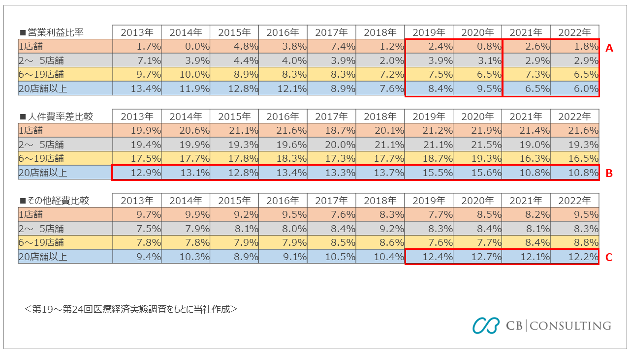 営業利益率は、2020年までは規模が大きくなればなるほど高くなっています(表A)。大手チェーンを対象にした調剤基本料の評価見直しなどを背景に、2021年と2022年の営業利益率にはやや異なる傾向が見られますが、それでも依然として薬局経営には『規模の経済が働いている』といえます。まさに小売業の特徴である規模による経営効率の差が如実に表れたデータです。