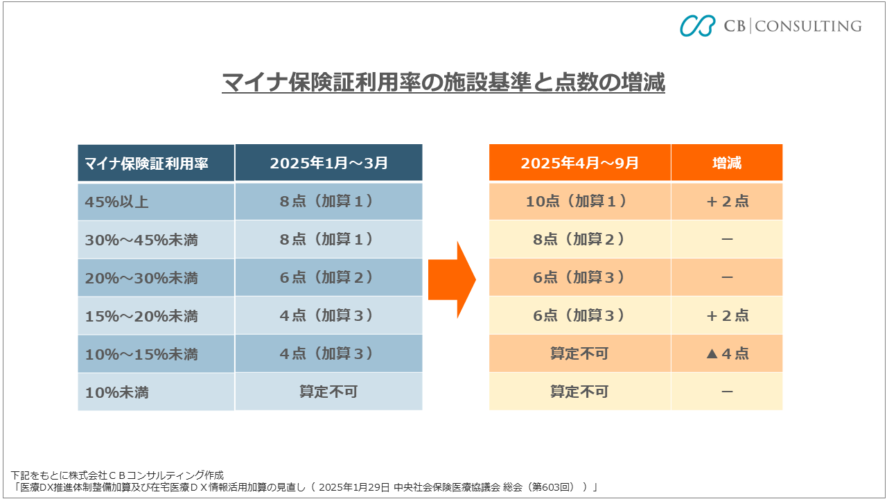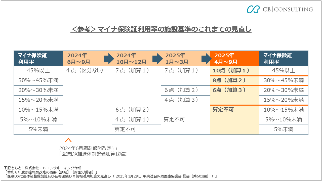 マイナ保険証利用率の3段階の評価基準が変更され、「10%/20%/30%」から「15%/30%/45%」へと引き上げられます。なお、2025年10月以降の基準については未定で、2025年7月をめどに検討・設定される予定です。
