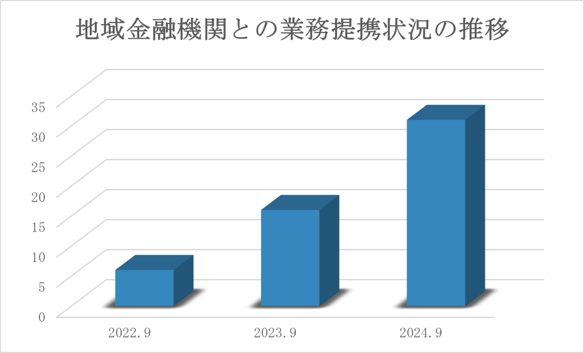 昨今、医療・介護・福祉業界は、今なお続く人材の慢性的な不足や地域偏在に加え、経営者の高齢化による承継問題や医療費抑制に向けた各種報酬改定など厳しい経営環境に置かれており、当社グループの顧客が抱える課題も多様化しております。時代の流れとともに業界経営者が抱える経営課題も変化する中で、当社グループが提供する経営支援サービスを通じて、より幅広い顧客の課題解決を目指すため、主に地域金融機関とのアライアンス強化を推進する所管部署として2021年10月1日に、当社では地域連携室が発足しました。その後、約3年にわたるアライアンス活動を経て、当社グループと業務提携契約を締結した地域金融機関が、この度、2024年9月末日時点をもって、各地域で高いシェアを占める金融機関を含む累計30機関以上となりました。