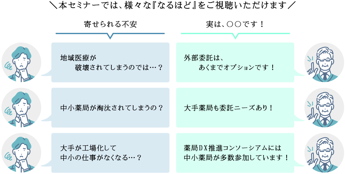 本セミナーでは、薬局DX推進コンソーシアム代表で薬局経営者でもある狭間氏と当社による解説やトークセッションなどにより、