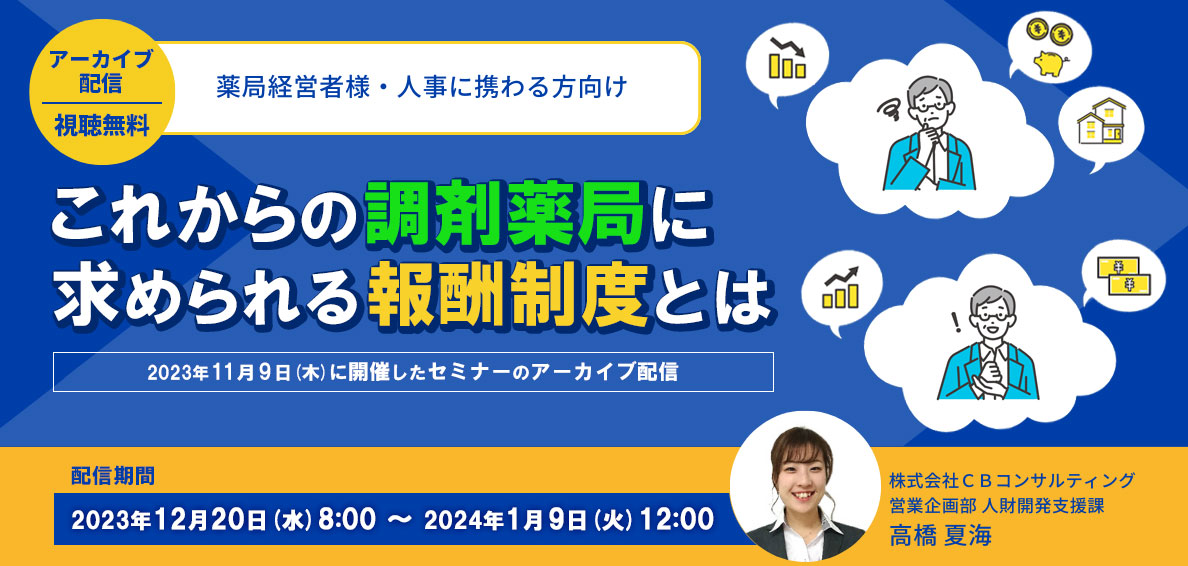 本セミナーでは、生き残る調剤薬局にはどのような報酬制度が必要なのか、 また、多くの法人様がつまづいてしまう点についても、実例を交えてご紹介いたします。