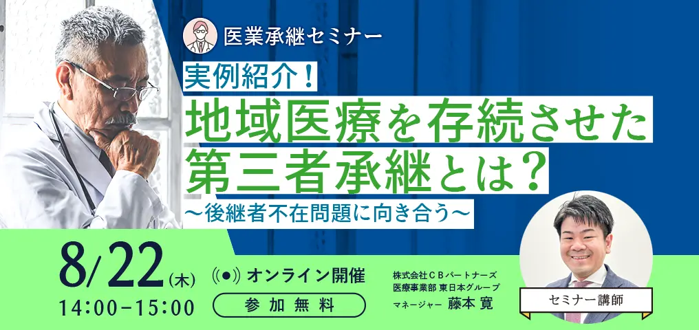今回のセミナーでは医療業界の承継支援に特化したCBパートナーズが、後継者問題に対する解決策の一つとして、「第三者承継の成功事例」について紹介します。本セミナーが課題解決のためのヒントを得る機会となればと幸いです。ぜひお気軽にご参加ください。
